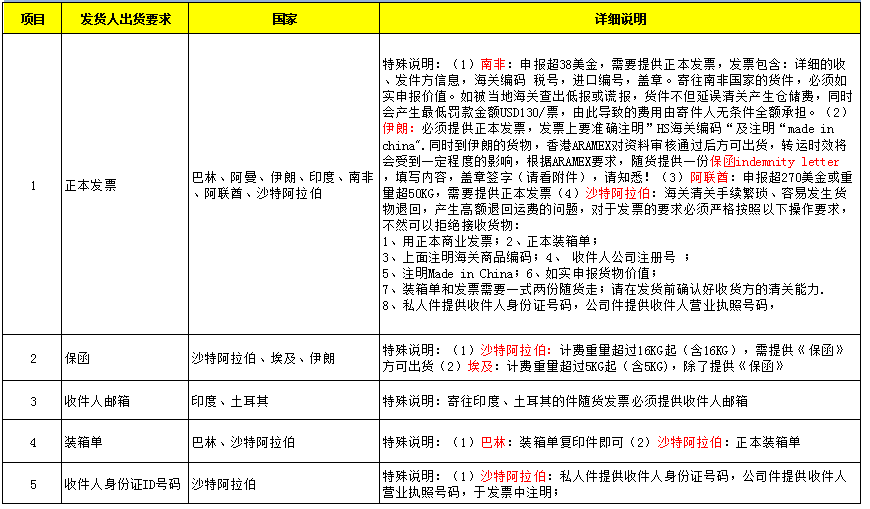 接香港Aramx服务商通知,Aramex渠道更新操作要求,请各代理知悉并转达发件方留意寄件前审核寄运货物是否符合相关规定。另我司明确此渠道禁止所有带电产品寄运,我司出货前不予再次审核,如因货物或随货资料问题导致香港服务商拒绝收货或当地清关问题等,由此产生的延误及相关费用均由发货人承担。 造成不便,敬请见谅!